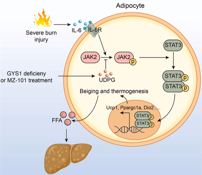 研究團隊發現在燒傷后,小鼠與人類白色脂肪組織中的GYS1表達均顯著上調。脂肪組織特異性Gys1基因敲除能夠有效抑制燒傷引發的白色脂肪組織褐變及脂解過程,改善肝臟脂肪變性并顯著提高生存率。值得注意的是,Gys1敲除并未影響棕色脂肪組織的正常產熱功能,也未緩解肌肉組織的消耗現象。分子機制研究人員發現Gys1缺失會促使UDPG在細胞內大量積累,這些積聚的UDPG通過不依賴β3-腎上腺素能或P2Y14受體通路的獨特方式,有效抑制了IL-6誘導的JAK2-STAT3信號通路的激活。通過分子對接與表面等離子共振實驗,研究團隊證實了UDPG與JAK2蛋白之間存在直接的特異性結合。更重要的是,研究人員采用特異性GYS1小分子抑制劑MZ-101進行燒傷治療,可成功模擬基因敲除的效果,顯著提升脂肪組織內UDPG水平,重現包括抑制白色脂肪組織褐變、改善肝臟脂肪變性在內的多種表型改善效果,并最終顯著提高燒傷實驗動物的生存率。